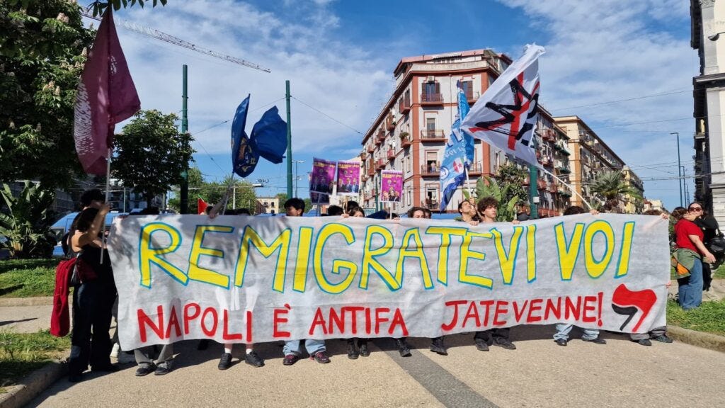 Mentre scrivevamo la newsletter, la polizia ha caricato gli antifascisti in corteo. Compagne e compagni si dirigevano verso il Millennium Golden Hotel di Capodichino, blindato dal dispositivo poliziesco. All’interno della struttura si sta svolgendo l’iniziativa dei neonazisti della remigrazione, cui partecipa anche l’ex ministro della Cultura del governo Meloni Gennaro Sangiuliano. Abbiamo raggiunto, per una corrispondenza in diretta, Davide Dioguardi, compagno di No Kings Napoli.