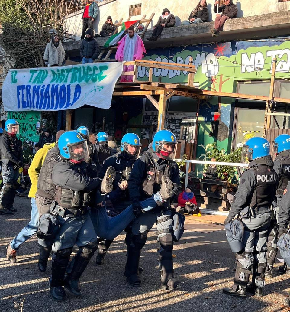 VICENZA - Dopo ore di resistenza, le forze dell’ordine hanno sgomberato l’area del Boscodromo di Vicenza per cominciare i lavori di abbattimento dell’edificio di via Rossi 198, nell’ambito dei cantieri Tav in mezzo alla città berica. Attivisti e attiviste hanno resistito incatenandosi, utilizzando estintori e lanci di frutta contro l’escavatore e gli agenti. Durante lo sgombero le forze dell’ordine hanno fatto uso di lacrimogeni. Lo stabile è stato sgomberato. Dalle 18.30, partendo dal presidio al bosco di Ca’ Alte, corteo per attraversare ancora il quartiere dei Ferrovieri e ribadire che la lotta contro la devastazione del Tav, anche a Vicenza, non si ferma.