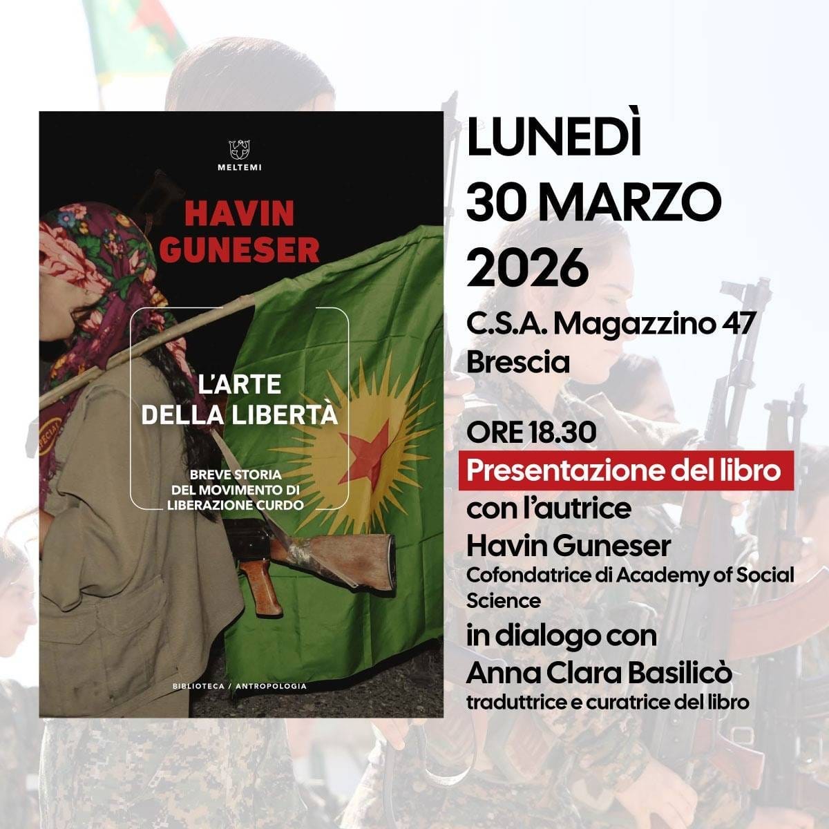 Lunedì 30 marzo 2026, alle ore 18.30, il centro sociale Magazzino 47 (via Industriale 10, Brescia) ospiterà la presentazione del libro “L’arte della libertà. Breve storia del movimento di liberazione curdo” (Meltemi, 2025) di Havin Guneser. Sarà presente l’autrice, Havin Guneser, ingegnera, giornalista e cofondatrice di The Academy of Social Science, già ospite di Radio Onda d’Urto per alcune interviste rilasciate alla nostra emittente. Dialogherà con lei Anna Clara Basilicò, traduttrice e curatrice dell’edizione italiana del libro. L’intervista su Radio Onda d’Urto ad Anna Clara Basilicò.