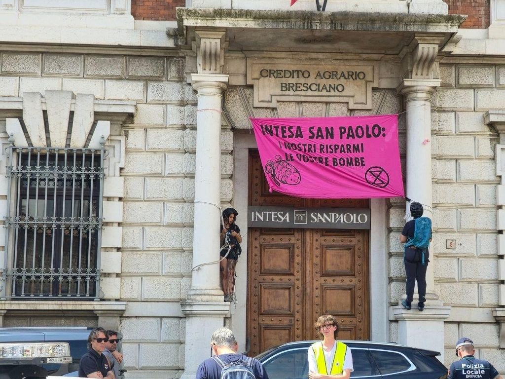 Un flash mob contro Intesa San Paolo, la cui sede si trova all’interno dell’ex Credito agrario bresciano, in Piazza Paolo VI (Piazza Duomo, in foto) per denunciare come la banca torinese sia “una delle prime 40 banche al mondo per finanziamenti all’industria del fossile ed ha investito, tra il 2016 e il 2023, 2,135 miliardi di dollari nel settore delle armi”, aveva fatto sapere in un comunicato XR.