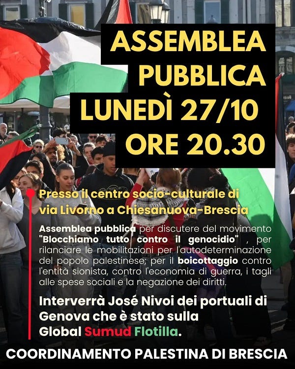 BRESCIA - Apriamo la newsletter ricordando l’importante assemblea pubblica di stasera, lunedì 27 ottobre, a Brescia sulla Palestina e su come rilanciare, nella nuova fase, la mobilitazione popolare. Ci vediamo dalle ore 20.30 al Centro socioculturale di via Livorno, 7, quartiere Chiesanuova, Brescia, come illustrato in una conferenza stampa ospitata negli studi di Radio Onda d’Urto: ascolta qui.