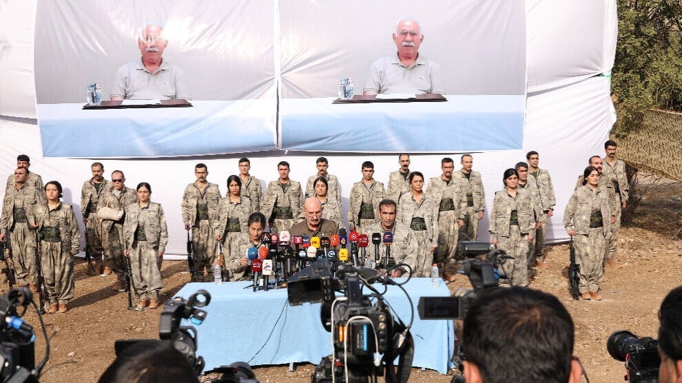 A comunicare il ritiro Sabri Ok, del comitato esecutivo del KCK (Unione delle comunità del Kurdistan),. Al suo fianco 25 guerrigliere-i, tra cui Vejîn Dersîm, delle YJA Star e Devrîm Palu, del Consiglio di Comando delle HPG, giunti dal Kurdistan turco a quello iracheno. Il Movimento di liberazione del Kurdistan ha quindi annunciato di “aver avviato il processo di ritiro di tutte le forze di guerriglia dalla Turchia alle Zone di Difesa di Medya (Kurdistan iracheno), al fine di far avanzare il processo di Pace e Società Democratica alla seconda fase”. La dichiarazione di domenica 26 ottobre sottolinea la “necessità di adottare senza indugio approcci politici e legali e invitiamo l’intera popolazione a mobilitarsi” in tal senso.