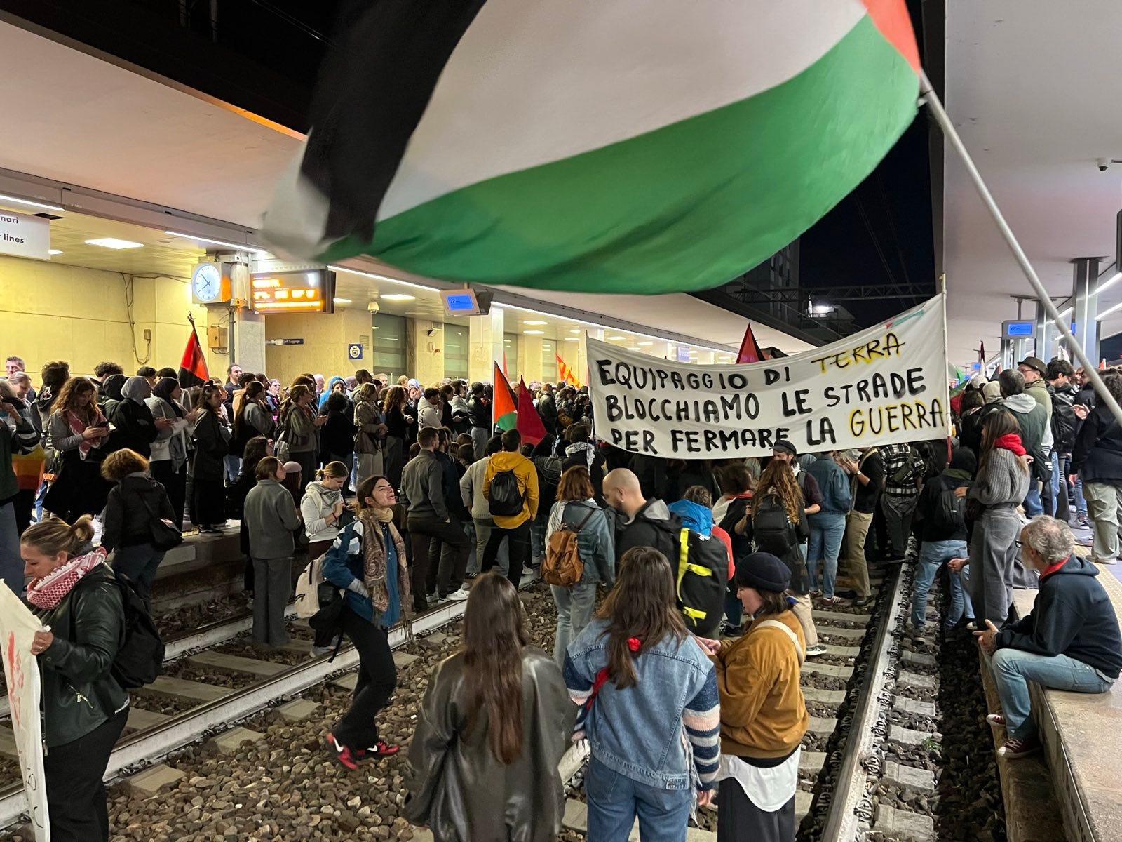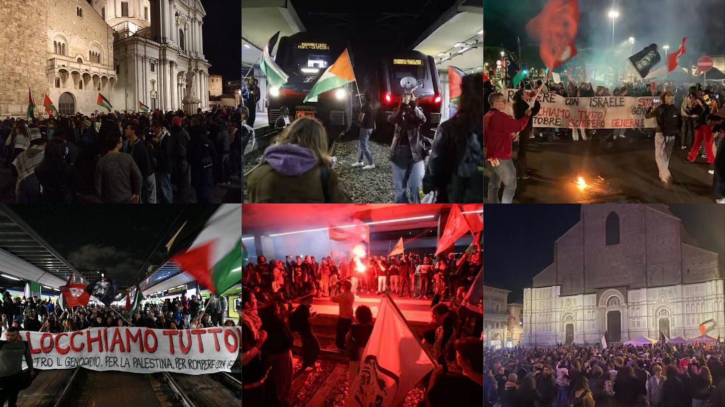 A Napoli, Pisa, Milano, Torino, Firenze e Taranto, sono state bloccate le stazioni; a Genova e Livorno bloccati porti e autostrade; a Roma oltre 20.000 persone hanno manifestato a pochi passi dai palazzi del potere. A Torino in serata uno spezzone del corteo è entrato nelle Officine Grandi Riparazioni - OGR dove ci sono state cariche della polizia, pochi minuti prima dell’invio di questa newsletter. Domani alle OGR sono attesi una serie di incontri tra Ursula Von der Leyen, Jeff Bezos e John Elkann. A Bologna scontri tra manifestanti e polizia davanti alla stazione dei treni e poco dopo in via Carracci, dove si era spostata una parte del corteo.