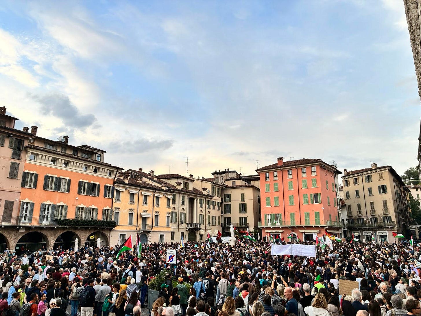 Oggi, lunedì 22 settembre, sciopero generale lanciato dall’Unione Sindacale di Base con l’adesione di Adl Cobas, Cobas, Cub e Sgb. Parola d’ordine: “Blocchiamo tutto!”. In tutta Italia e per tutto il giorno molte centinaia di migliaia di persone in piazza in un centinaio di città (in foto Piazza Loggia, a Brescia, stracolma stamattina nonostante la fitta pioggia) tra manifestazioni, cortei, piazze e blocchi per la Palestina, contro il genocidio e l’occupazione, per sostenere le iniziative di solidarietà internazionale, come quella della Global Sumud Flotilla, in corso nel Mediterraneo e diretta a Gaza.
