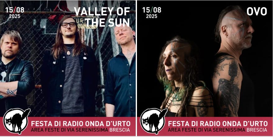PALCO PRINCIPALE - Ferragosto 2025 a tutto hard rock, tra stoner, industrial, noise e pennellate metal per la Festa di Radio Onda d’Urto! Questa sera, venerdì 15 agosto, sul palco principale di via Serenissima, atterrerà dagli Usa l'astronave sonora dei VALLEY OF THE SUN. Nella stessa serata anche gli OvO, storica band italiana da sempre proiettata sui palchi di mezzo mondo grazie alla capacità di essere, da un quarto di secolo, un oggetto... estraneo e misterioso del panorama musicale internazionale.