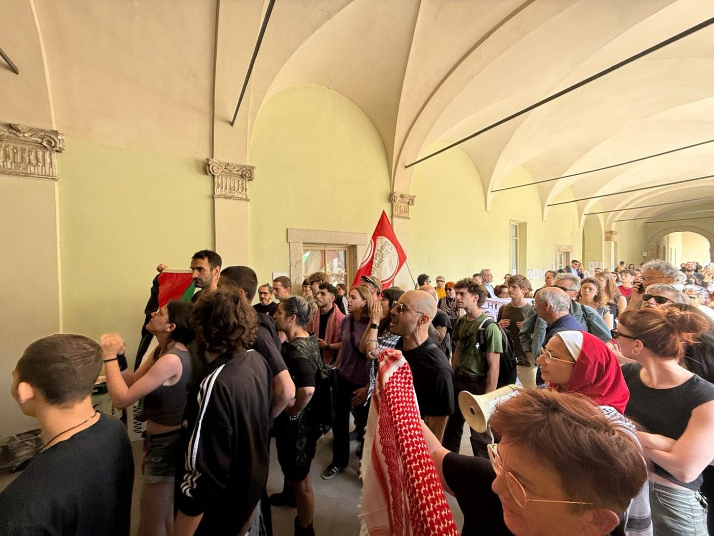 Dentro il cortile di Giurisprudenza, a due passi dall’aula magna, sono riusciti a entrare almeno 150 manifestanti, di GPI e Coordinamento Palestina, arrivati a pochi metri dal ministro e dalla sua scorta. “Fuori Tajani, fuori Israele dall’Università. Basta complicità con occupazione e genocidio, Palestina Libera” le parole d’ordine dell’iniziativa.
