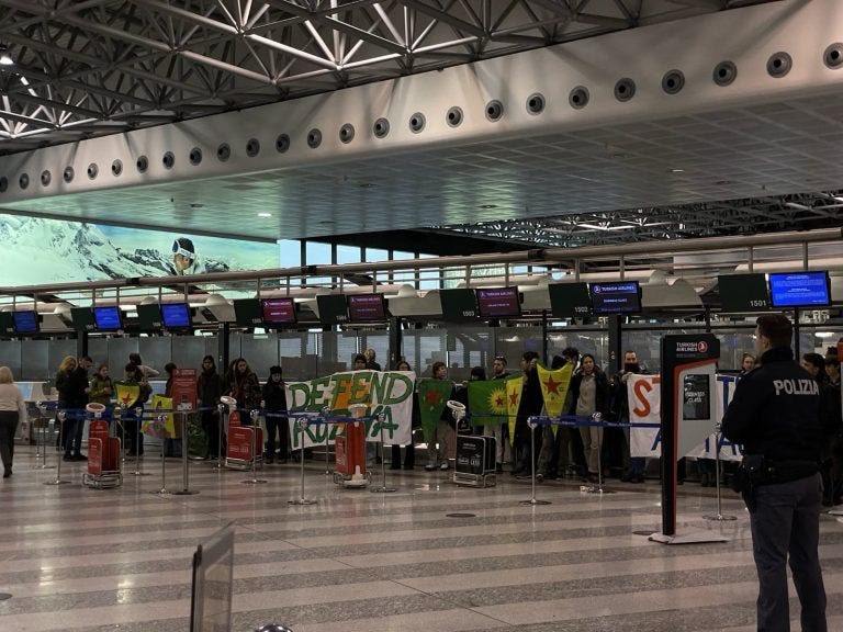 Sul fronte della solidarietà internazionale stamattina all'aeroporto di Malpensa decine di solidali con la rivoluzione in Rojava hanno bloccato i check-in di Turkish airlines. Duro l'intervento repressivo della polizia che ha effettuato - con la forza e anche prendendo a pugni alcuni attivisti - diversi fermi. Sono stati tutti e tutte rilasciate nel primo pomeriggio. La nostra redazione è riuscita a raccogliere la corrispondenza di un’attivista, raggiunta proprio nel momento del rilascio delle persone fermate, e la testimonianza di uno dei fermati. Di seguito un estratto della corrispondenza: