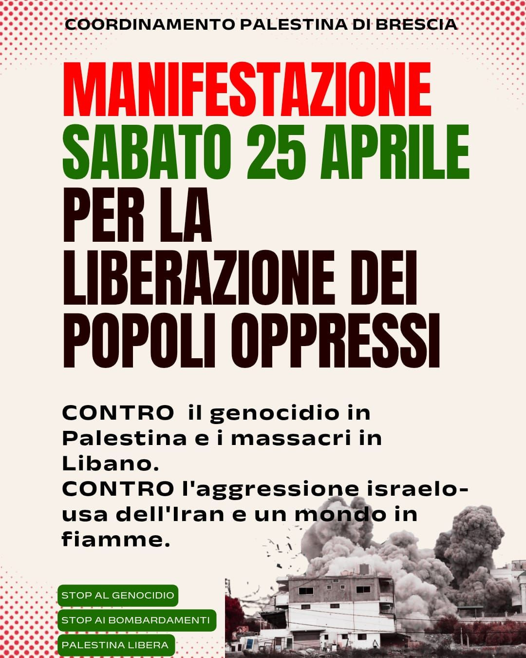 Sabato 25 aprile 2026, il Coordinamento Palestina di Brescia in corteo per l’81esimo anniversario della Liberazione dalla dittatura fascista e dall’occupazione nazista.