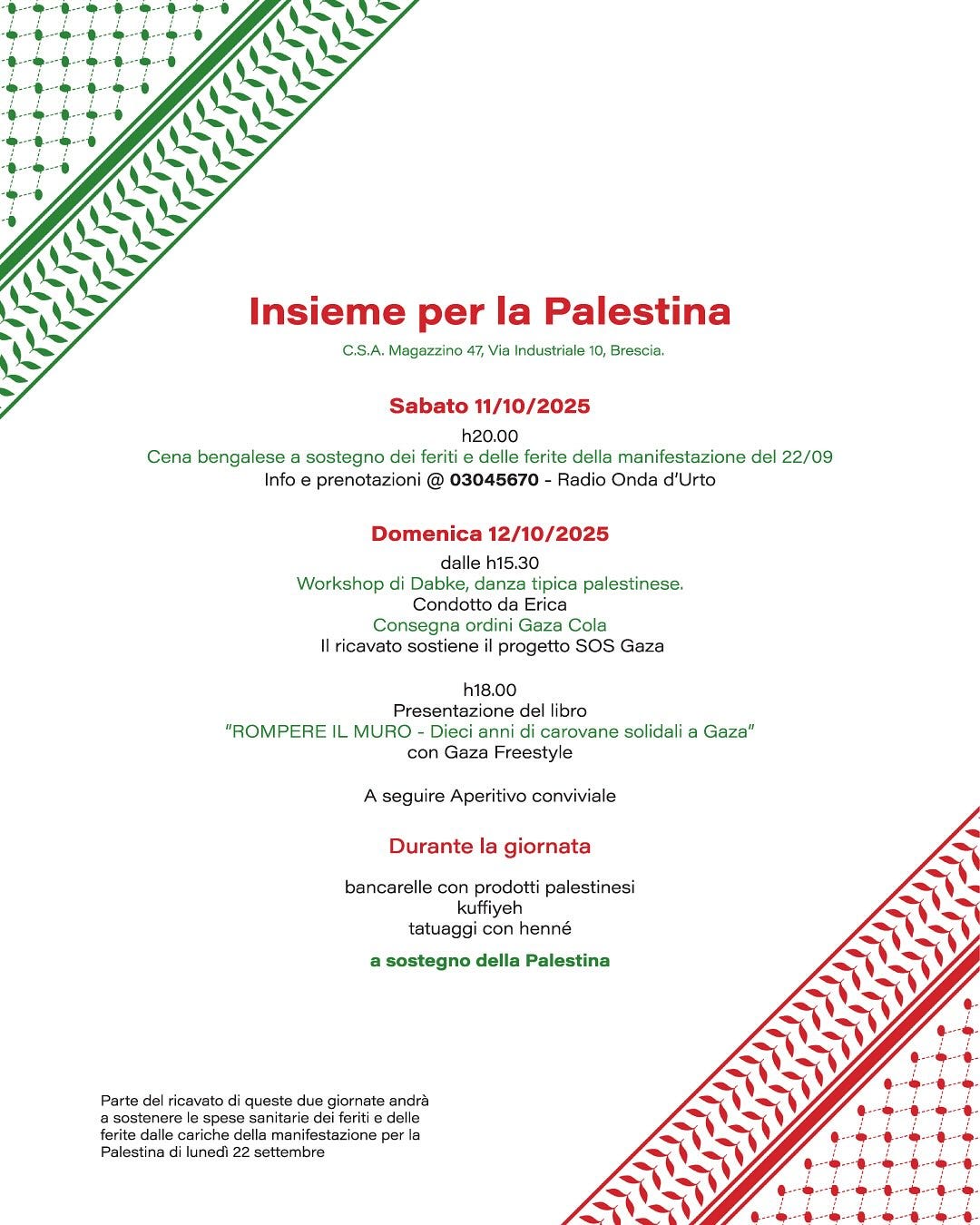Sempre a Brescia, sabato 11 e domenica 12 ottobre al Csa Magazzino 47 la due giorni “Insieme per la Palestina”. Qui il programma.