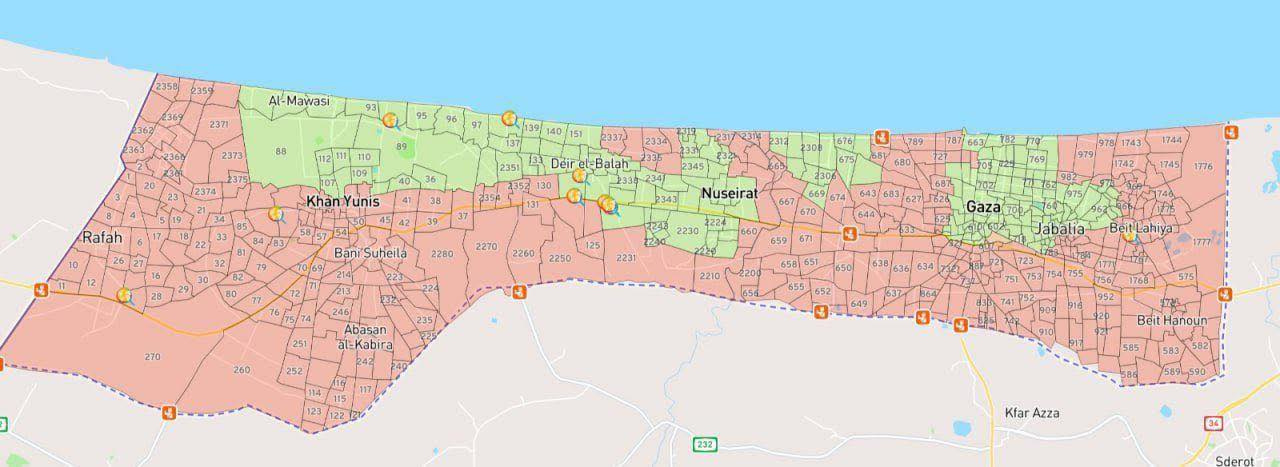 PALESTINA - Prosegue e, se possibile, si intensifica il genocidio impunito per mano israeliana nella Striscia di Gaza; dove gran parte del territorio (in rosso, nella mappa) è ormai una "zona di annientamento", come la chiama l'esercito israeliano, consentendo ai propri militari di sparare (e bombardare) a qualsiasi cosa si muova.
