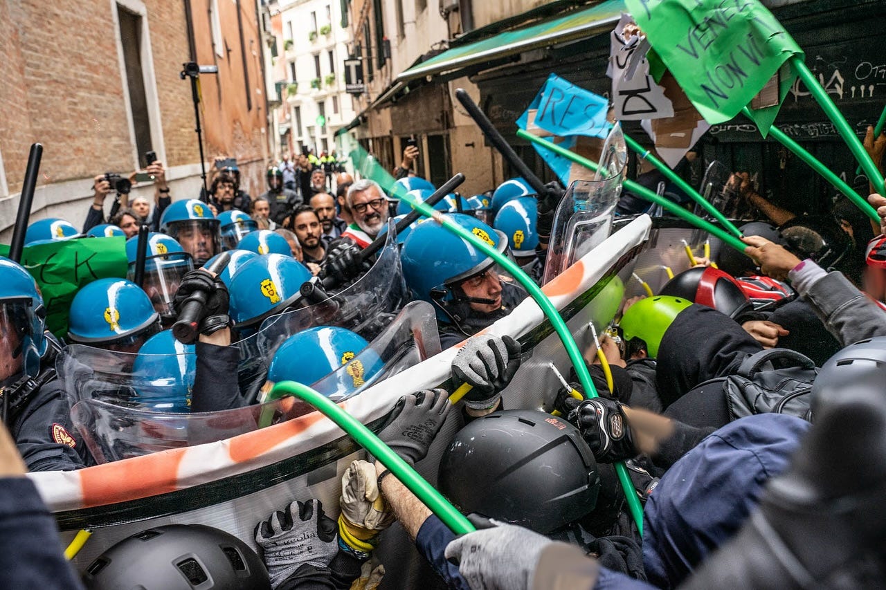 VENEZIA - Scontri, cariche e resistenza a Venezia tra polizia e manifestanti chiamati in piazza dal nodo lagunare della rete “A pieno regime – no dl sicurezza” contro la presenza in città di Meloni (poi assente per febbre) e del ministro Piantedosi. A meno di una settimana dall’inizio dell’iter per la conversione definitiva in legge del dl sicurezza, la Rete veneziana – con delegazioni di tutto il Veneto – si è ritrovata in Campo S. Angelo, dietro lo slogan "La vera sicurezza la fa chi vive e attraversa i territori!". Poi il corteo verso il Teatro La Fenice, dove Piantedosi stava per iniziare il suo intervento. In calle dei Frati un imponente blocco della polizia in assetto antisommossa, prodigo di manganellate verso i manifestanti, che a quel punto hanno dato vita a un corteo spontaneo fino al ponte di Rialto. Srotolato uno striscione che rilancia la mobilitazione nazionale contro il "decreto sicurezza", con un chiaro riferimento agli appuntamenti previsti a Roma il 26 e il 31 maggio.