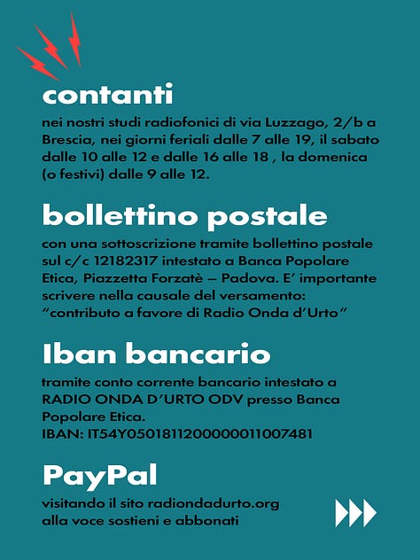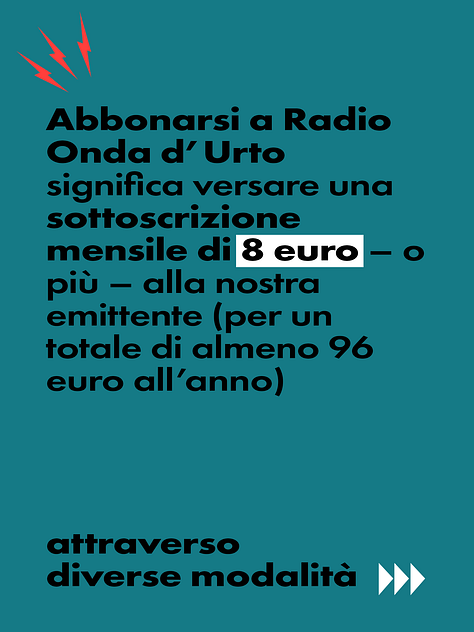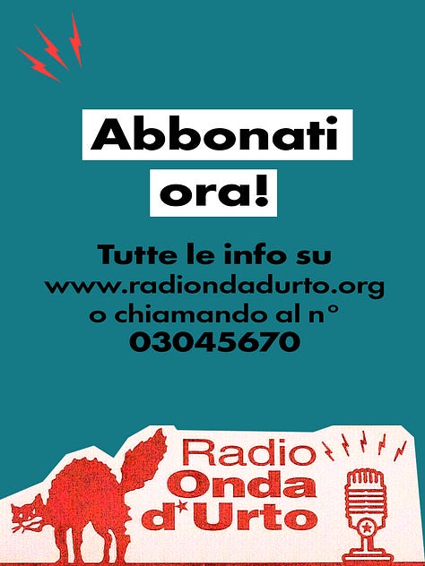 Una radio completamente autofinanziata, e per questo continuiamo a ricordarvi l’importanza di abbonarsi a Radio Onda d’Urto e continuare a sostenerla: bastano 8 euro al mese!