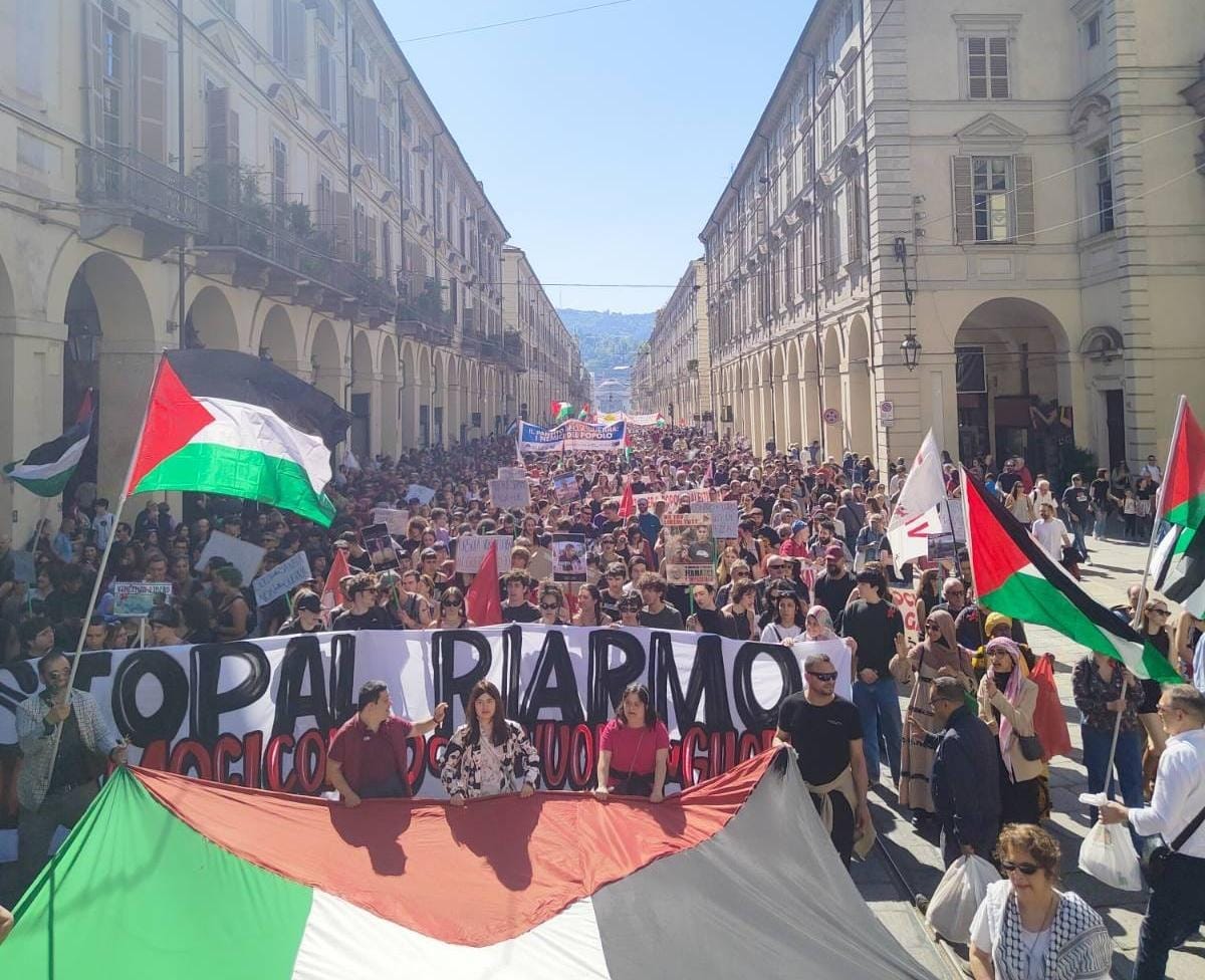 Migliaia di persone in piazza anche negli spezzoni di Roma e Torino. Nel capoluogo piemontese grande partecipazione allo spezzone dei movimenti, composto da centri sociali, lotte ambientali, realtà palestinesi e sindacalismo di base. Tra le parole d’ordine il “no” alla riconversione bellica del tessuto produttivo torinese, piegato da anni di forte deindustrializzazione con l’utilizzo indiscriminato di cassa integrazione.